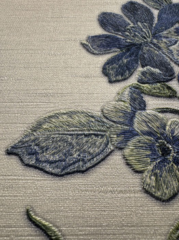 Luxury non-woven wallpaper with a light grey background and metallic blue flowers.