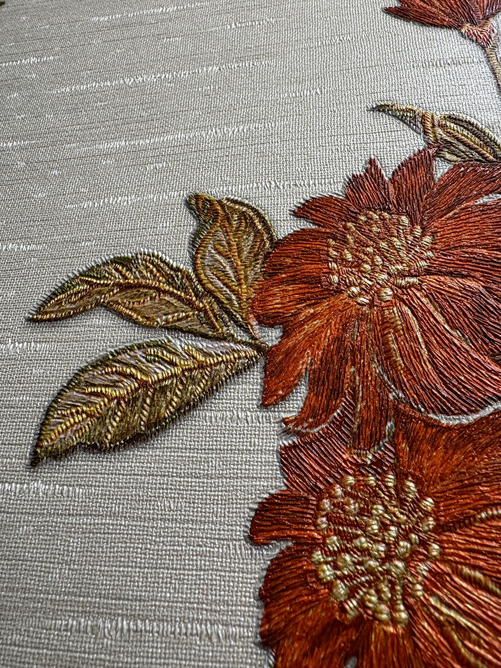 Luxury non-woven wallpaper with light beige background and metallic orange flowers, fabric texture.