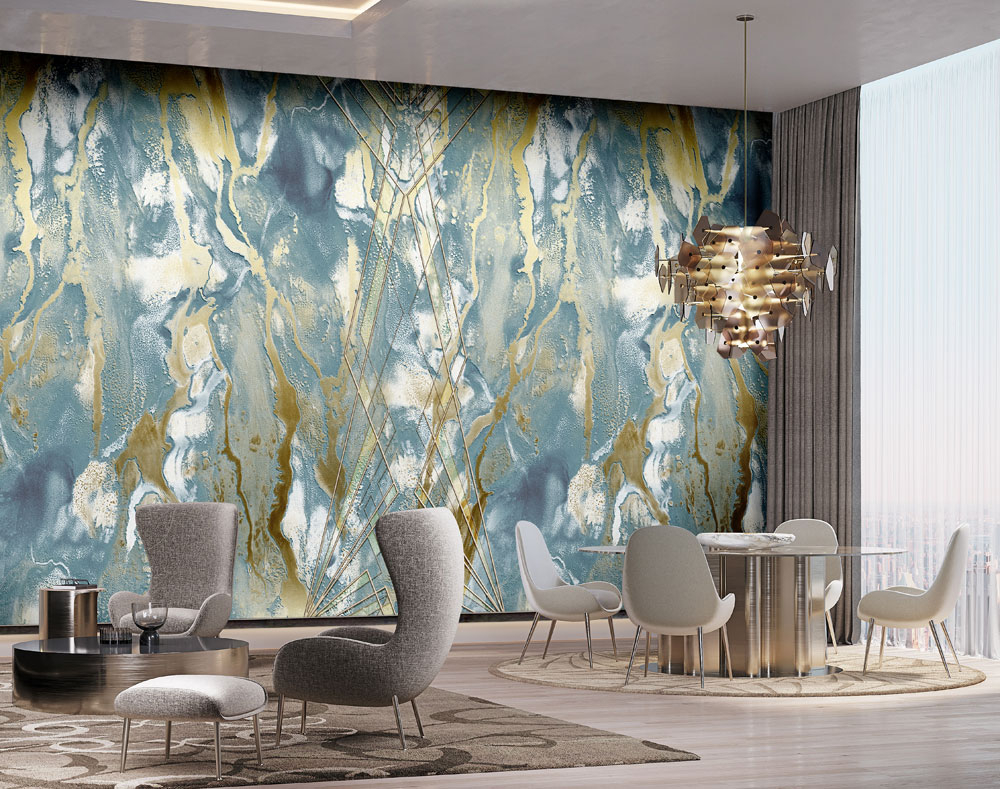 Luxury non-woven 3-piece decorative wallpaper mural with a distinctive stone pattern in a blue-white shade. The middle stripe has a golden geometric pattern.