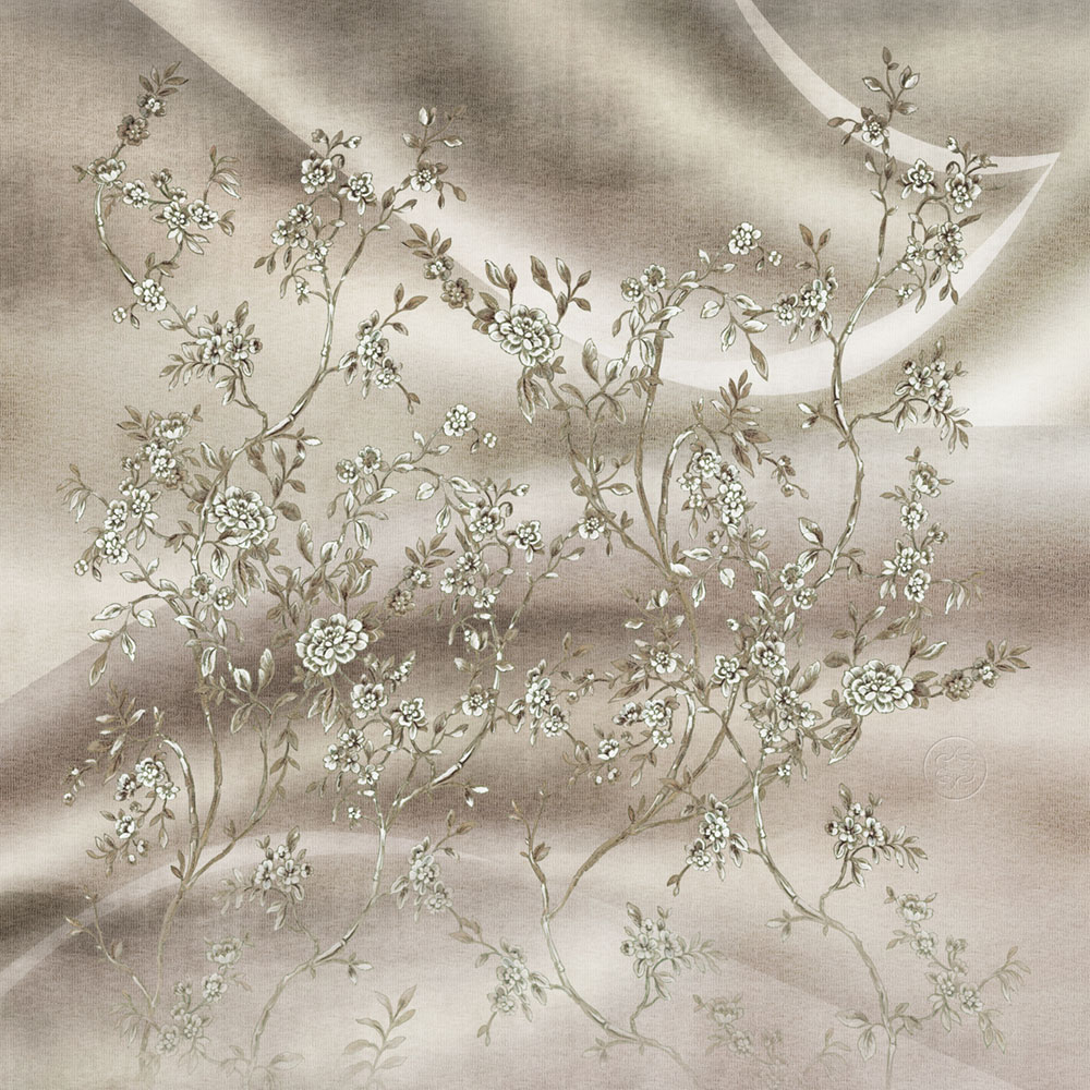 Luxury non-woven 3-piece decorative wallpaper mural with a pattern of stems with flowers on a gray-beige background with a decor of draped fabric.