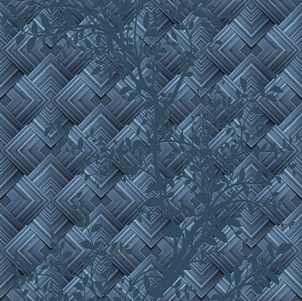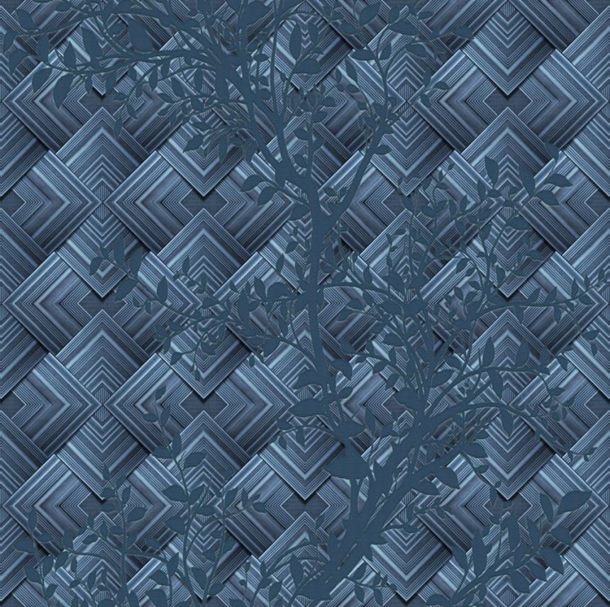 Luxury non-woven decorative wallpaper mural with a tree pattern with petals on a distinctive geometric background. The wallpaper is in blue-black shades. Can be combined with pattern Z64869