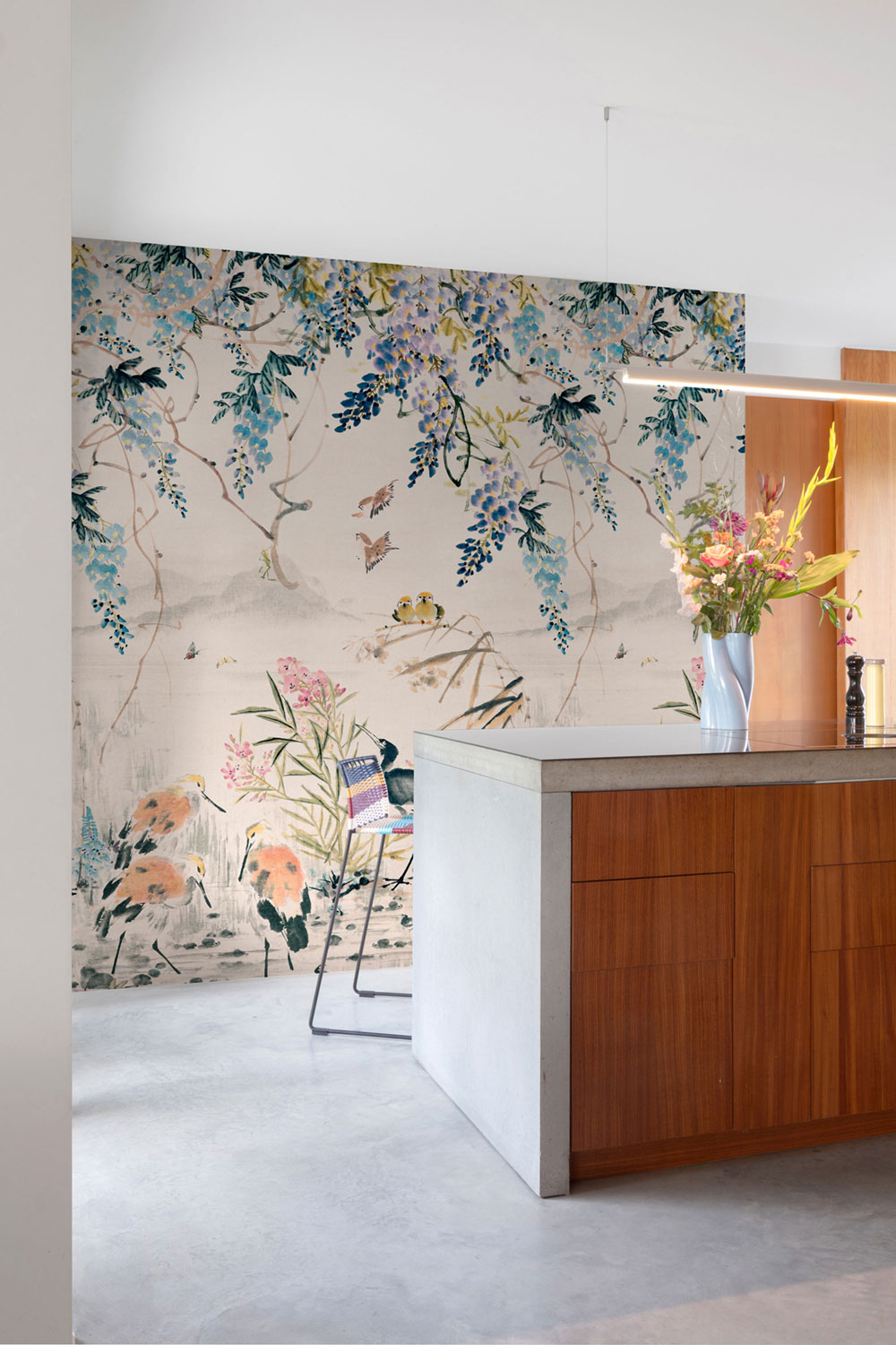 Non-woven mural wallpaper with a stunning motif of waterfowl and birds in a blooming Japanese garden.