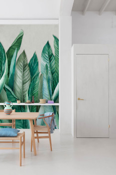 Refresh your space with a non-woven mural wallpaper featuring green banana leaves on a grey-cream background.