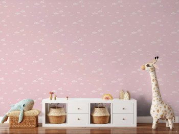 Paper wallpaper pink, motif of the sky, clouds, stars. The wallpaper has a fine textile texture.
