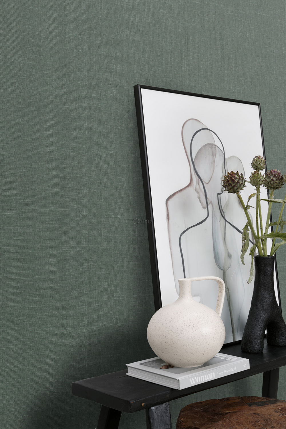 Non-woven wallpaper fabric imitation, melange in shades of green.