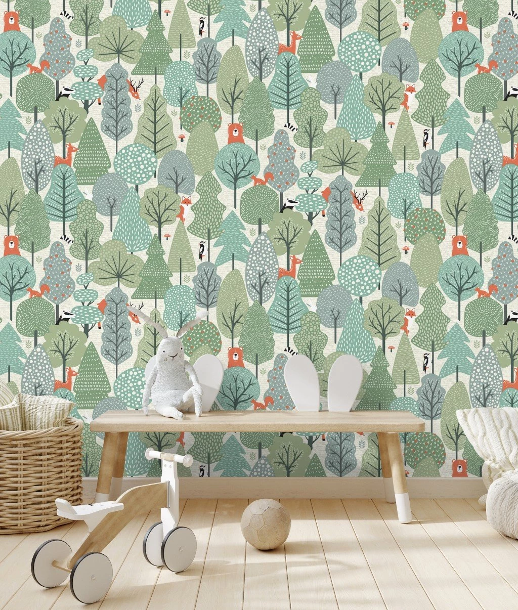 Non-woven children's wallpaper - motifs of forest animals and the forest.