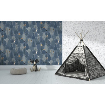Non-woven children's blue wallpaper - motifs of forest animals and forest.