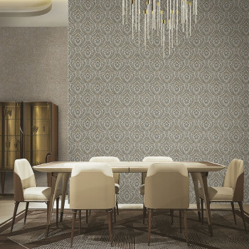 Beige luxury baroque wallpaper with a distinctive silver and black pattern will add a unique look to any interior.