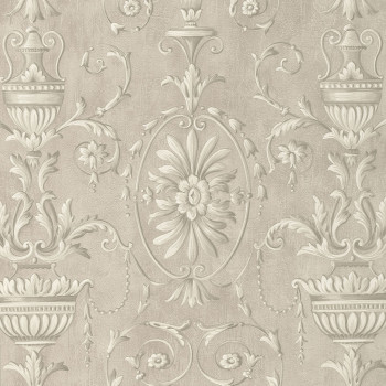 Luxury non-wovenwallpaper with baroque ornaments of flowers and vases on a coarse beige stucco background.