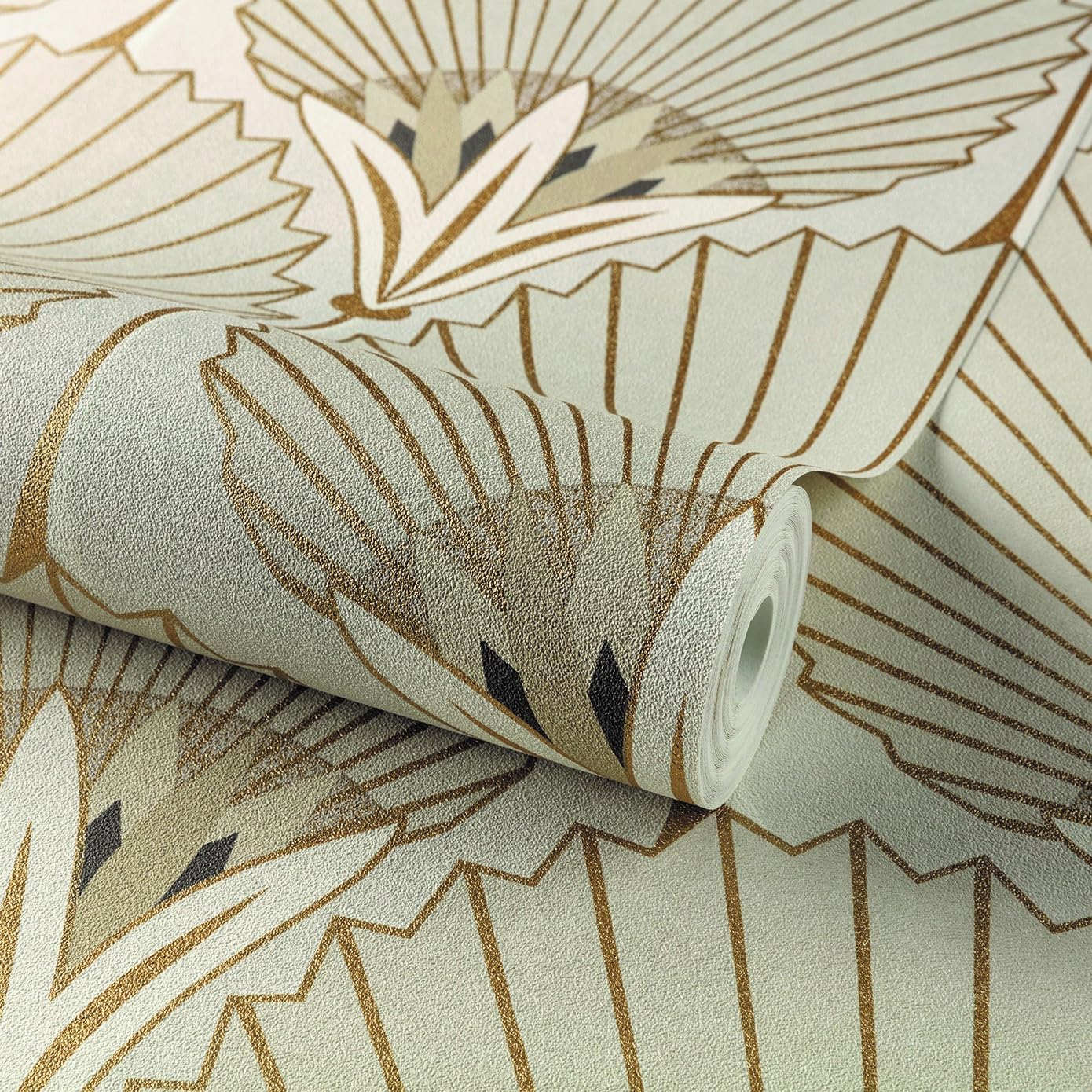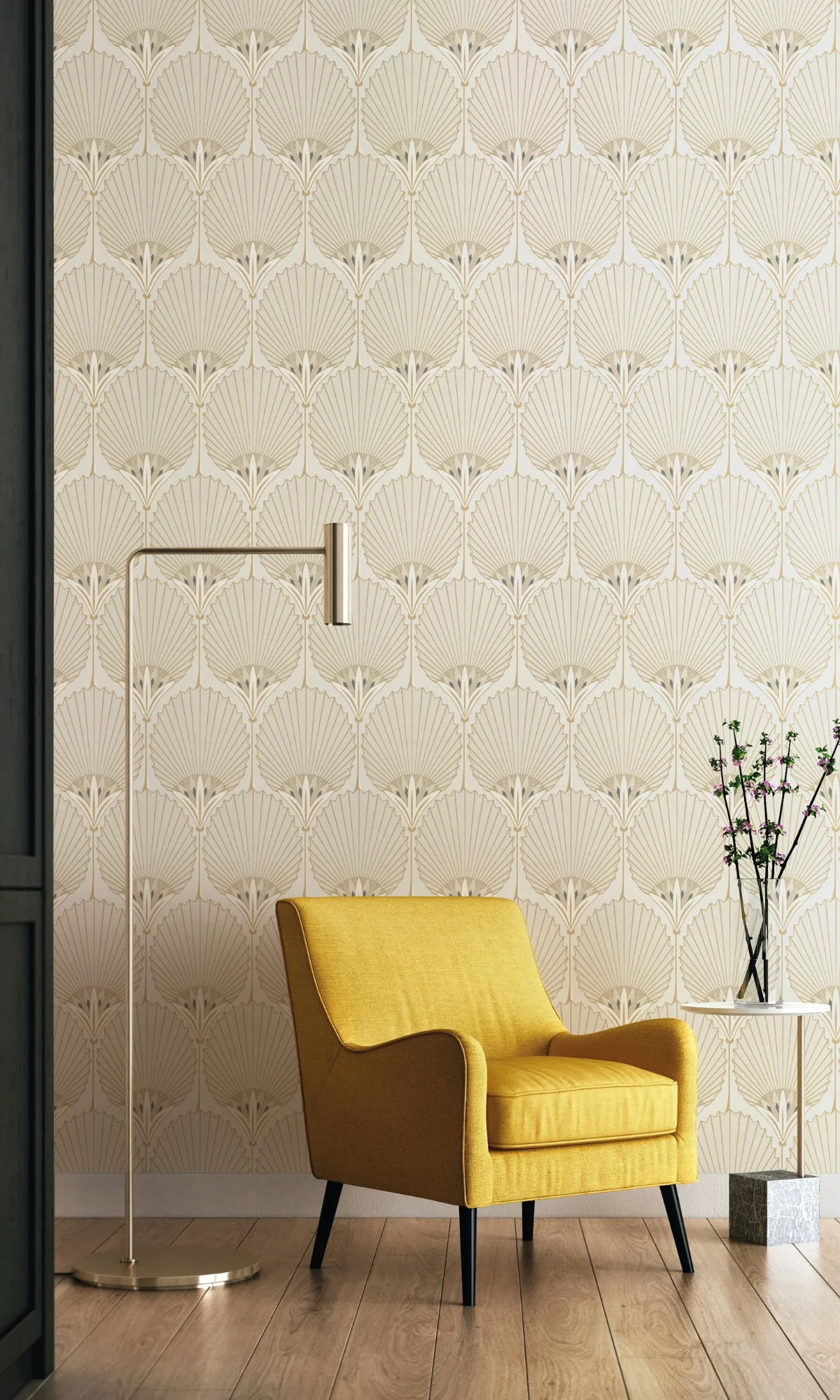 Non-woven wallpaper with golden geometric patterns on a textured cream background brings a pleasant atmosphere of luxury to the interior.