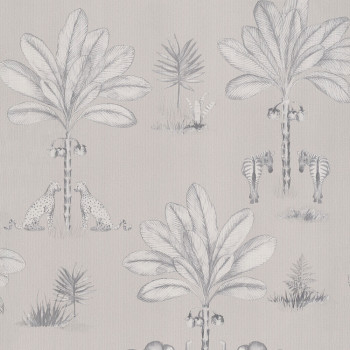 Gray-beige non-woven wallpaper for children's room - children's wallpaper - elephants, zebras, leopards, palm trees.