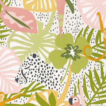 Colorful children's non-woven wallpaper - leaves, monkeys and parrots. The wallpaper has a fabric texture.