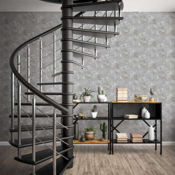 Gray non-woven wallpaper with golden metallic reflections and a distinctive stucco pattern.