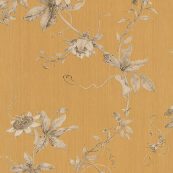 Non-woven wallpaper with a vinyl surface and a motif of plants and flowers on a yellow background.