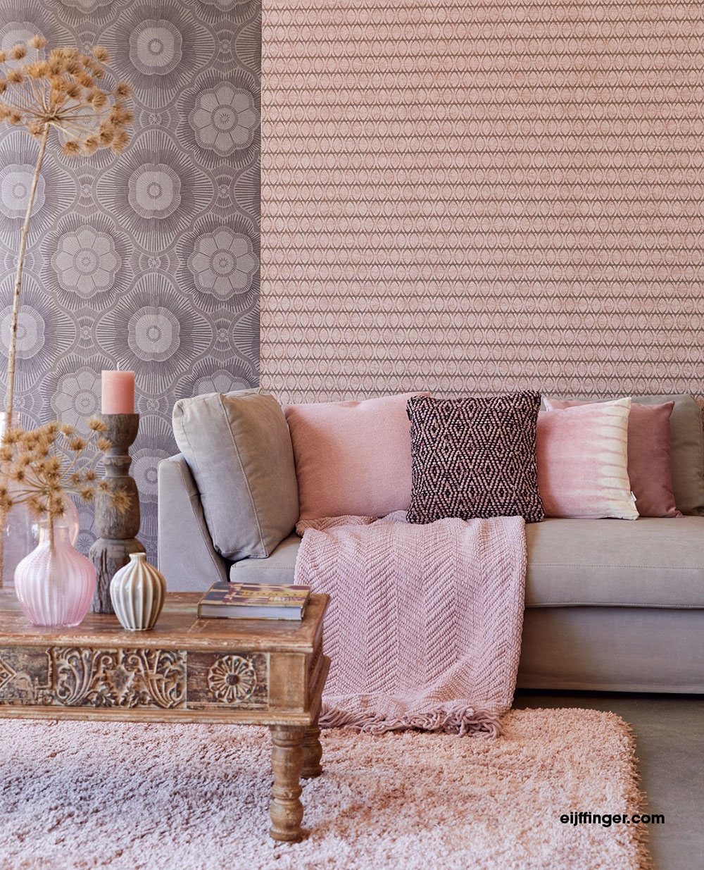 The elegant, subtle pattern gives the impression of fabric. In shades of brown combined with pink and a delicate metallic sheen, it will add a cozy touch to your interior.